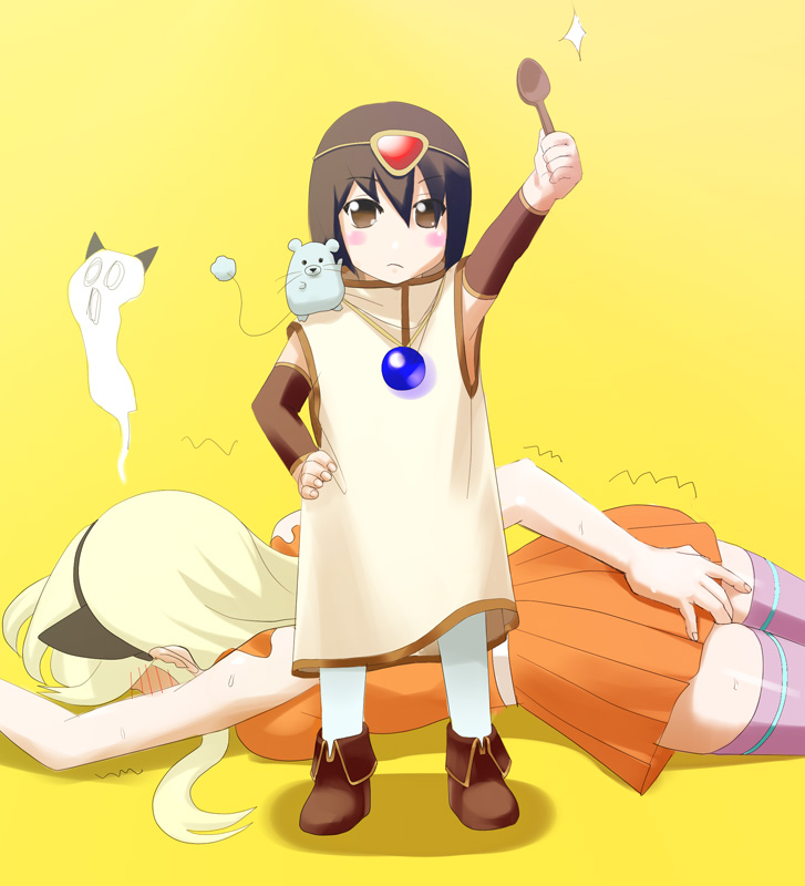 ririvery, moriya suwako, yasaka kanako, touhou, bad id, bad pixiv id, 2girls, blonde hair, blood, blue hair, female focus, girl on top, guro, hat, impaled, multiple girls, nail polish, red eyes, ribbon, rope, sandals, shimenawa, smile, straddling, thighhighs, toenail polish, toenails, zouri