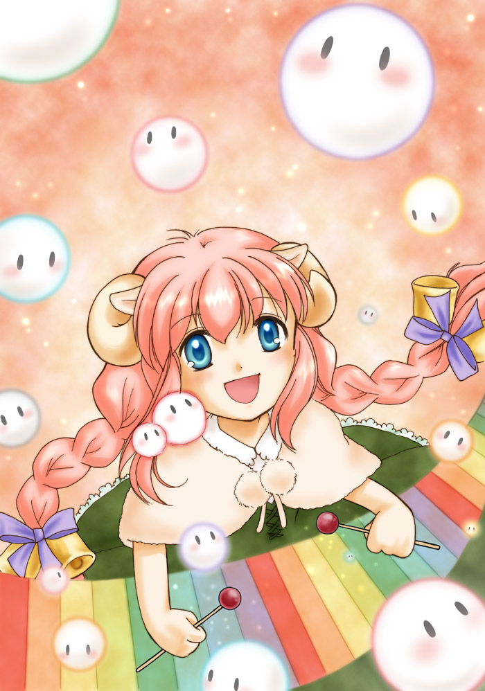 10sanimal earsbellblue eyesblushbowbraiddresshair bowhair ribbonhornsinstrumentlong hairopen mouthpink hairribbonsheep earssmilesolotwin braidsxylophone