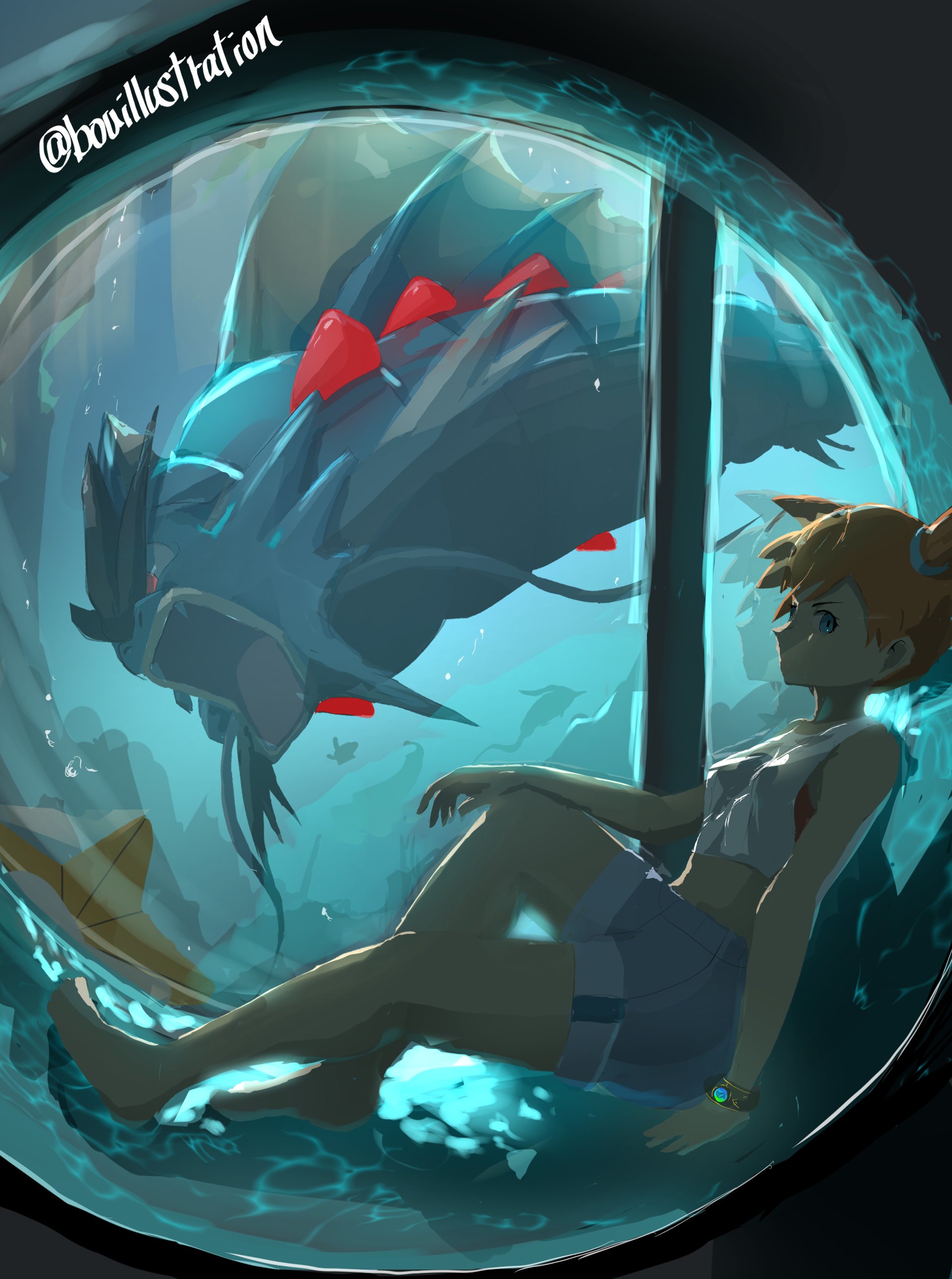 1girlair bubbleaquariumbare armsbarefootblue eyesblue shortsbubbleclosed mouthcrop topfrom sidegen 1 pokemonjewelrylooking at viewermega pokemonmidrifforange hairpokemon (creature)ponytailshirtshort hairshortsside ponytailsittingsleevelesssleeveless shirttoestwitter usernameunderwaterwaterwhite shirt