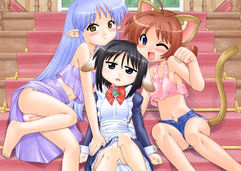 3girlsanimal earsbarefootblack eyesblack hairblue eyesblue hairblushbowbrown haircat earscat tailchokerdenimdenim shortsdog earsfeetflat chestmaidmidriffmultiple girlsnavelpantiespaw posepointy earsshortssittingsitting on stairsstairstailunderwearwhite pantiesyellow eyes