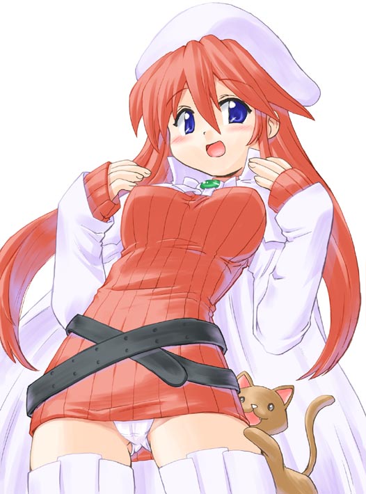 1girlbeltbelt skirtblue eyesblushcapecatfemale focushatlong hairpantiesred hairsmilesolothighhighsunderwearwhite panties