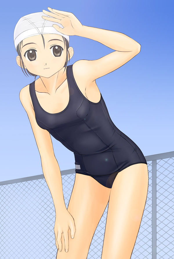 1girlchain-link fencecowboy shotdayfemale focusfencehand on own thighone-piece swimsuitoutdoorsschool swimsuitsoloswim capswimsuit
