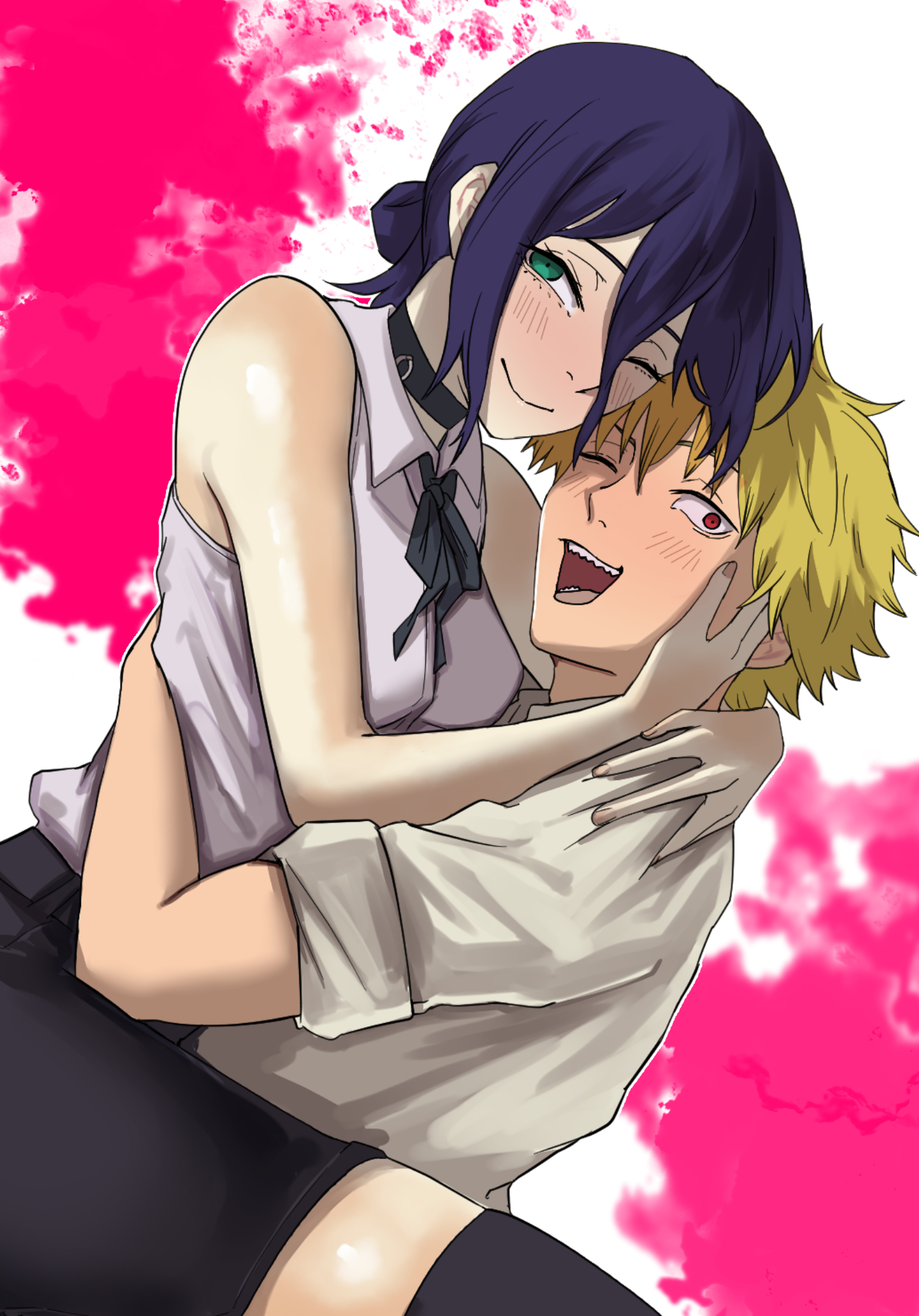 :d1boy1girlblack chokerblack hairblack ribbonblack shortsblack thighhighsblonde hairblushchokerclosed mouthgreen eyesgrenade pinhair between eyesheterohugneck ribbonone eye closedopen mouthred eyesribbonsharp teethshirtshort hairshortssleevelesssleeveless shirtsmileteeththighhighswhite shirt