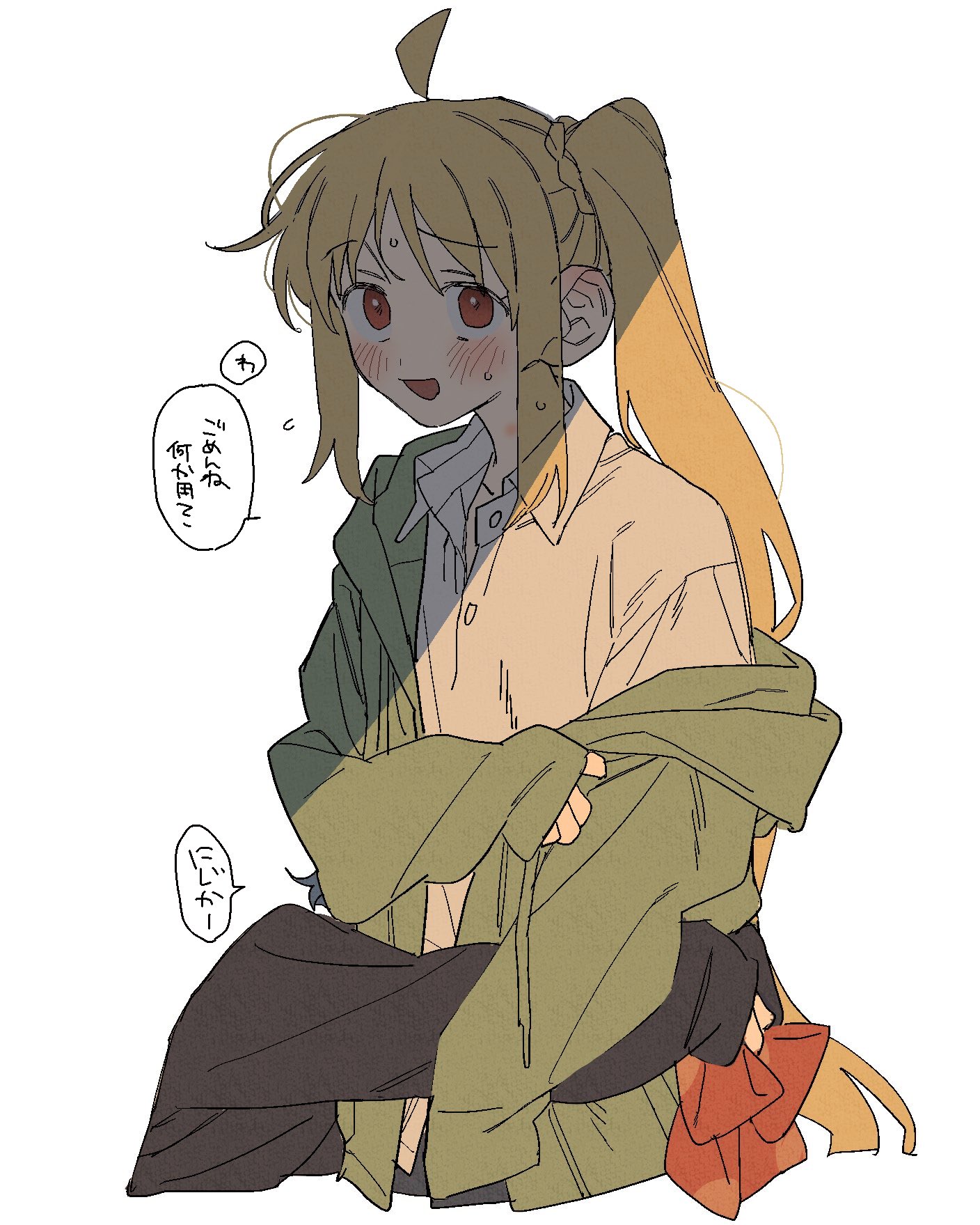 2girlsblack sweaterblue haircollared shirtgreen jackethugjacketlong hairlooking at viewermultiple girlsopen mouthponytailred eyesshirtsimple backgroundsmilespeech bubblesweatsweaterwhite backgroundwhite shirt