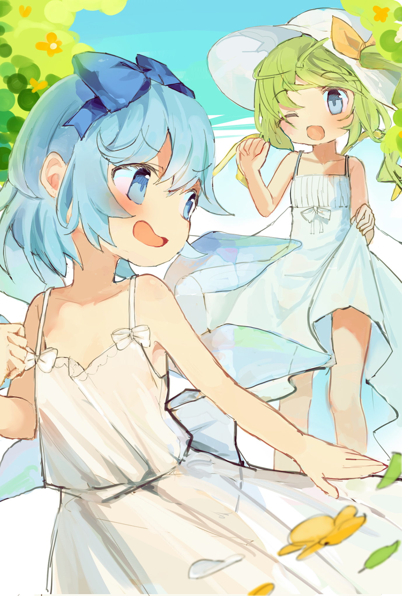:d2girlsalternate costumebare armsbare legsblue bowblue hairblushbowbow hairbandcollarbonedetached wingsdressfairyfairy wingsfalling petalsgreen hairhairbandhaticeice wingsmultiple girlsmultiple wingsone eye closedopen mouthoutdoorspetalssleevelesssleeveless dresssmilesun hatsundresswhite dresswhite hatwings