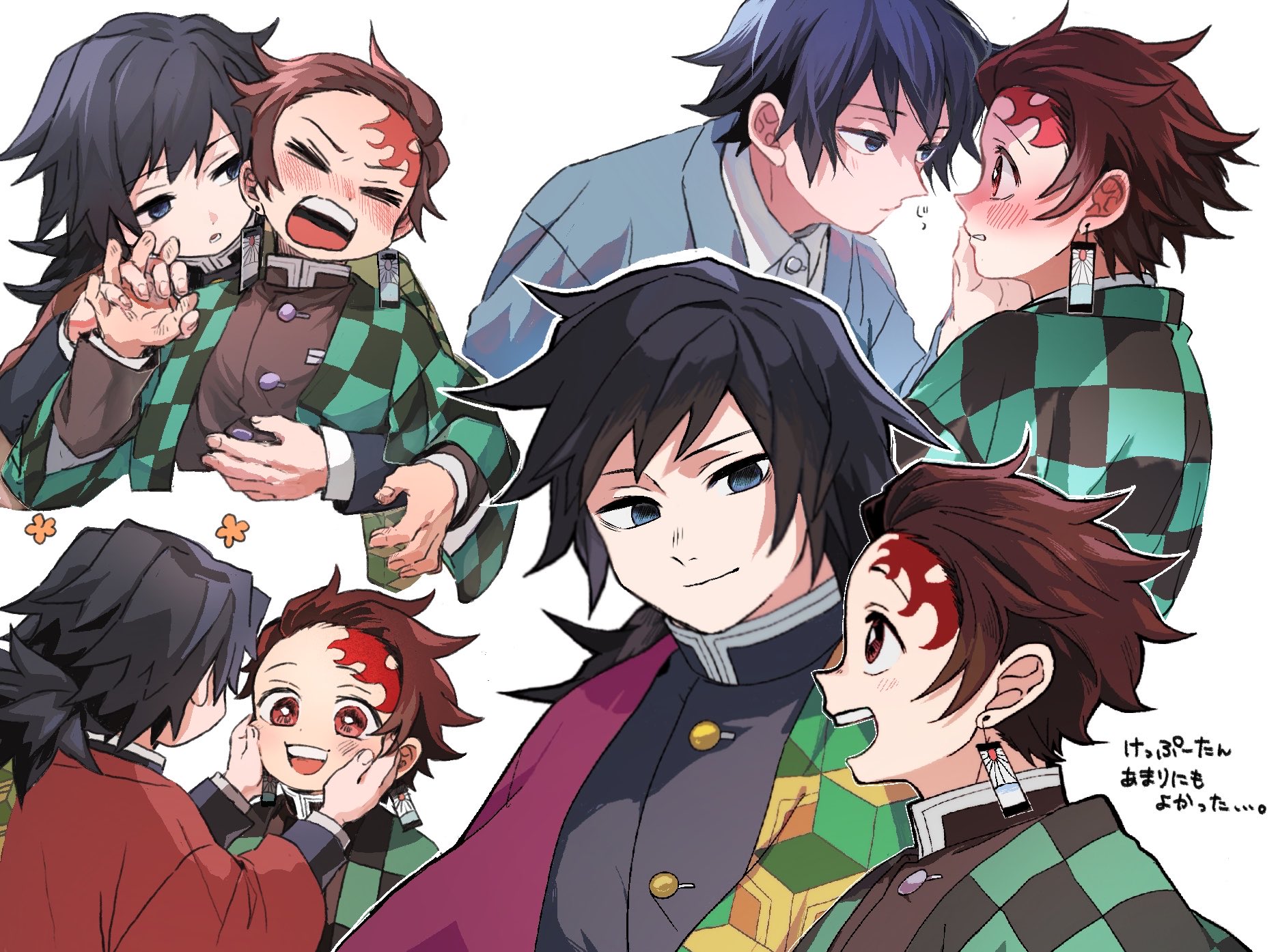 2boysalternate costumeblack hairblack jacketblue eyesblushbrown eyesbrown hairbuttonscheckered haoriclosed eyesclosed mouthdemon slayer uniformfrom behindfuayatori95gold buttonshaorihigh collarjacketjapanese clotheskikkoumonlooking at anotherlow ponytailmale focusmultiple boysmultiple viewsopen mouthponytailprint haoriprofilered haorisimple backgroundsmilespiked hairteethupper bodyupper teeth onlyyaoi