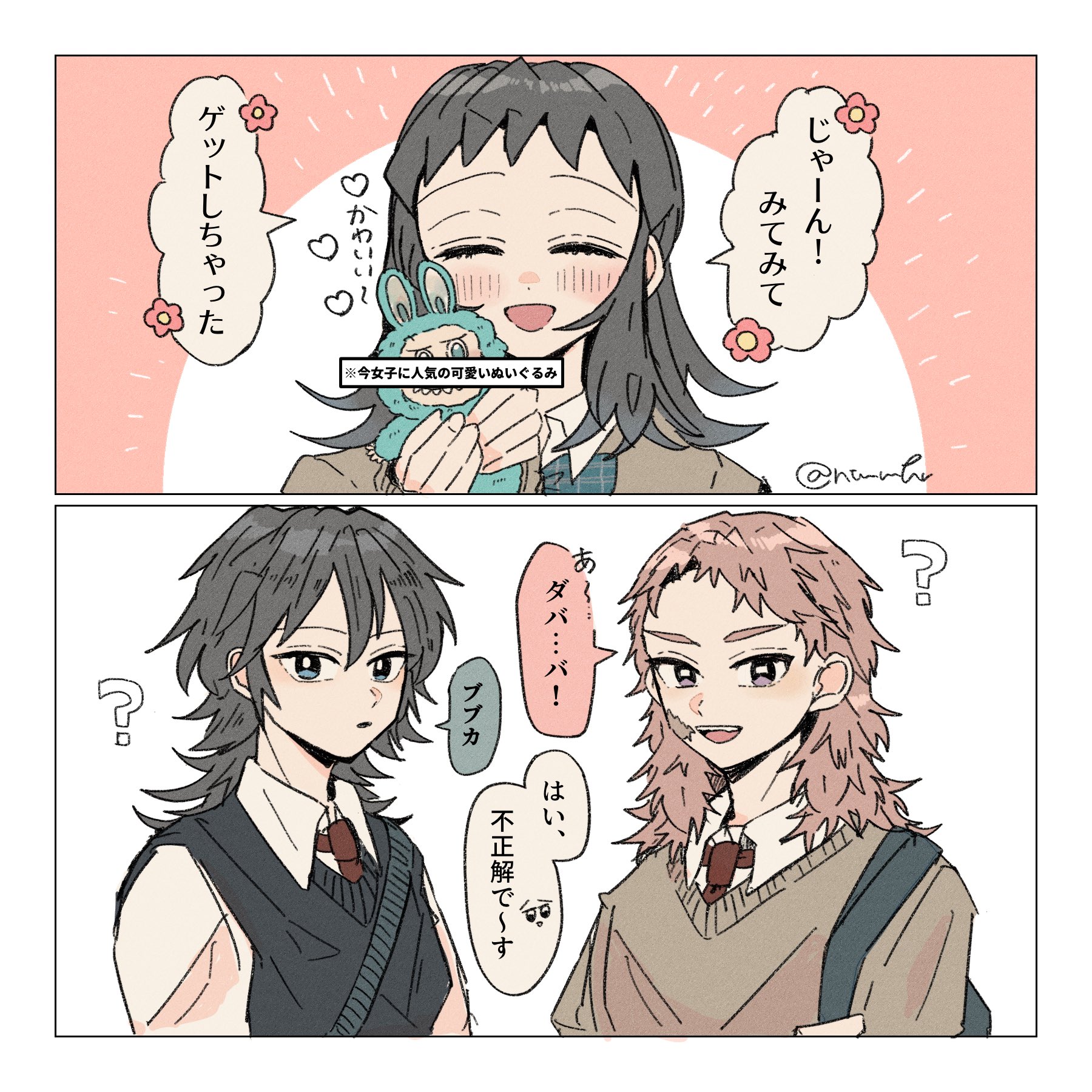 1boy1girl2boysalternate costumeblack vestblushbrown sweatercollared shirtfacing viewerheartholdinglong hairlooking at viewerlow ponytailmultiple boysnecktientmmhrponytailred necktieshirtspeech bubblespiked hairsweatertwitter usernameupper bodyvestwhite backgroundwhite shirt