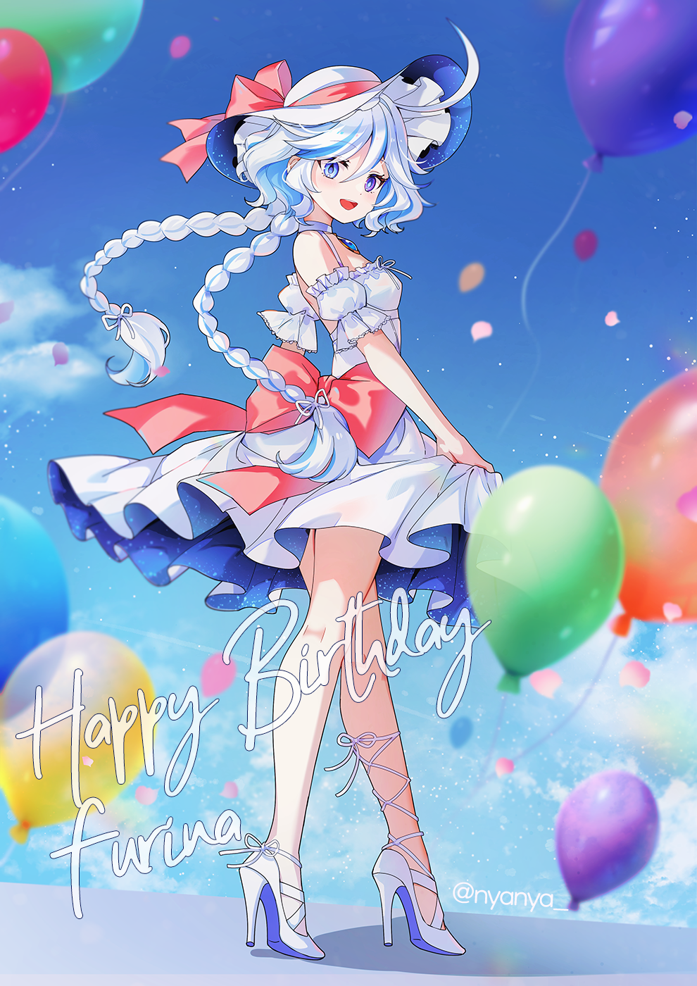 1girlahogealternate costumeballoonblue eyesblue hairblue skybraidbreastscharacter namedetached sleevesdressdrop-shaped pupilsfrom sidefull bodyhair between eyeshappy birthdayhatheterochromiahigh heelslong hairlooking at viewermulticolored hairopen mouthpink ribbonpuffy detached sleevespuffy sleevesribbonskirt holdskysmall breastssmilesolosun hatsymbol-shaped pupilstwin braidswhite dresswhite hairwhite hat
