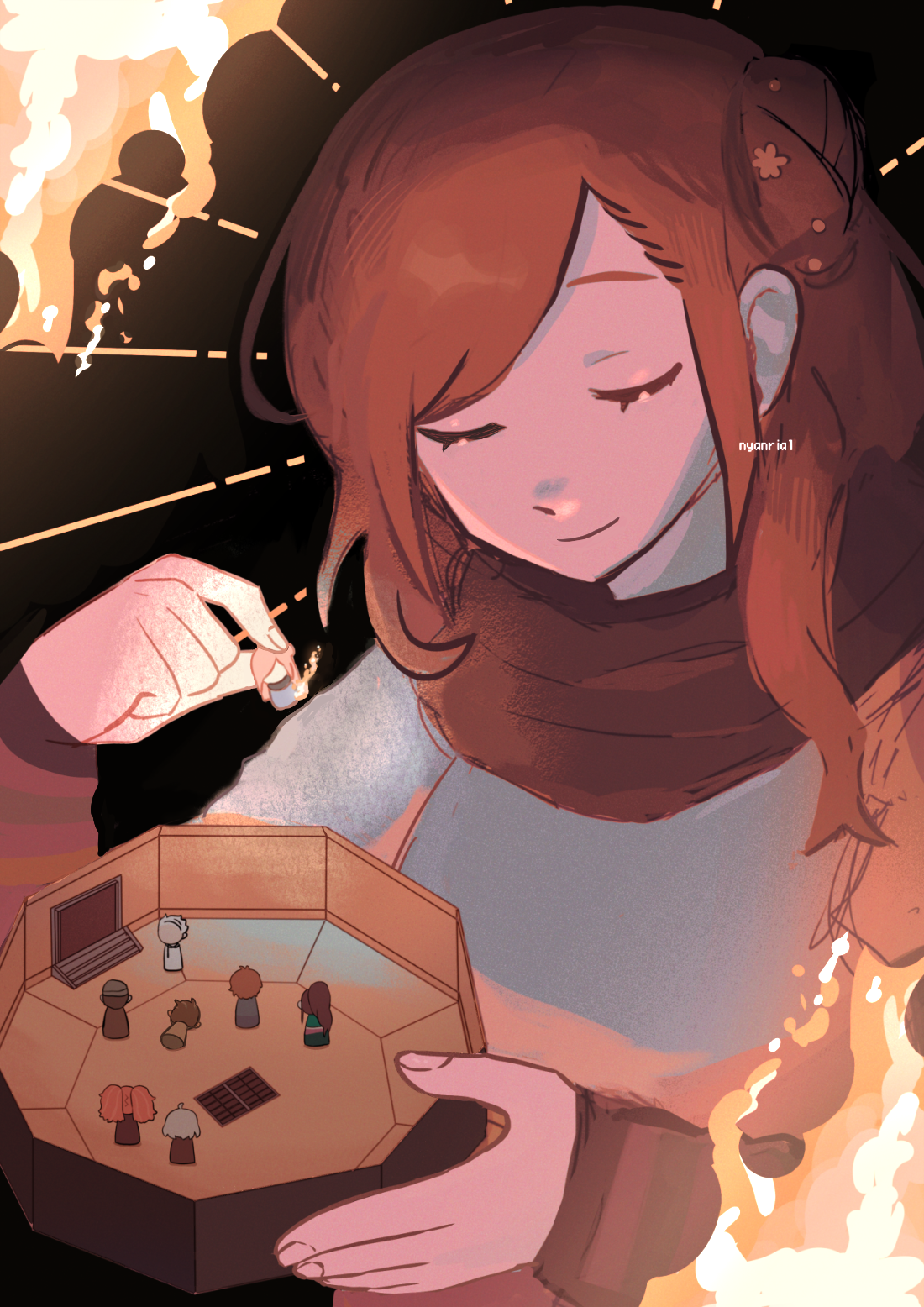 kinako kinako7, original, absurdres, commentary request, highres, marker (medium), traditional media, 1boy, autumn, blonde hair, boots, chain, flat cap, hat, lace, leaf, outdoors, poncho, sitting, solo, swing set, trap