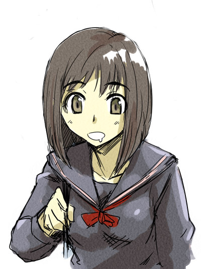 nekotarou (nktr299), akigumo (kancolle), kantai collection, commentary request, highres, translation request, 1girl, alternate costume, brown hair, clothes writing, green eyes, green shirt, hand up, long hair, open hand, shirt, solo, teeth, upper body
