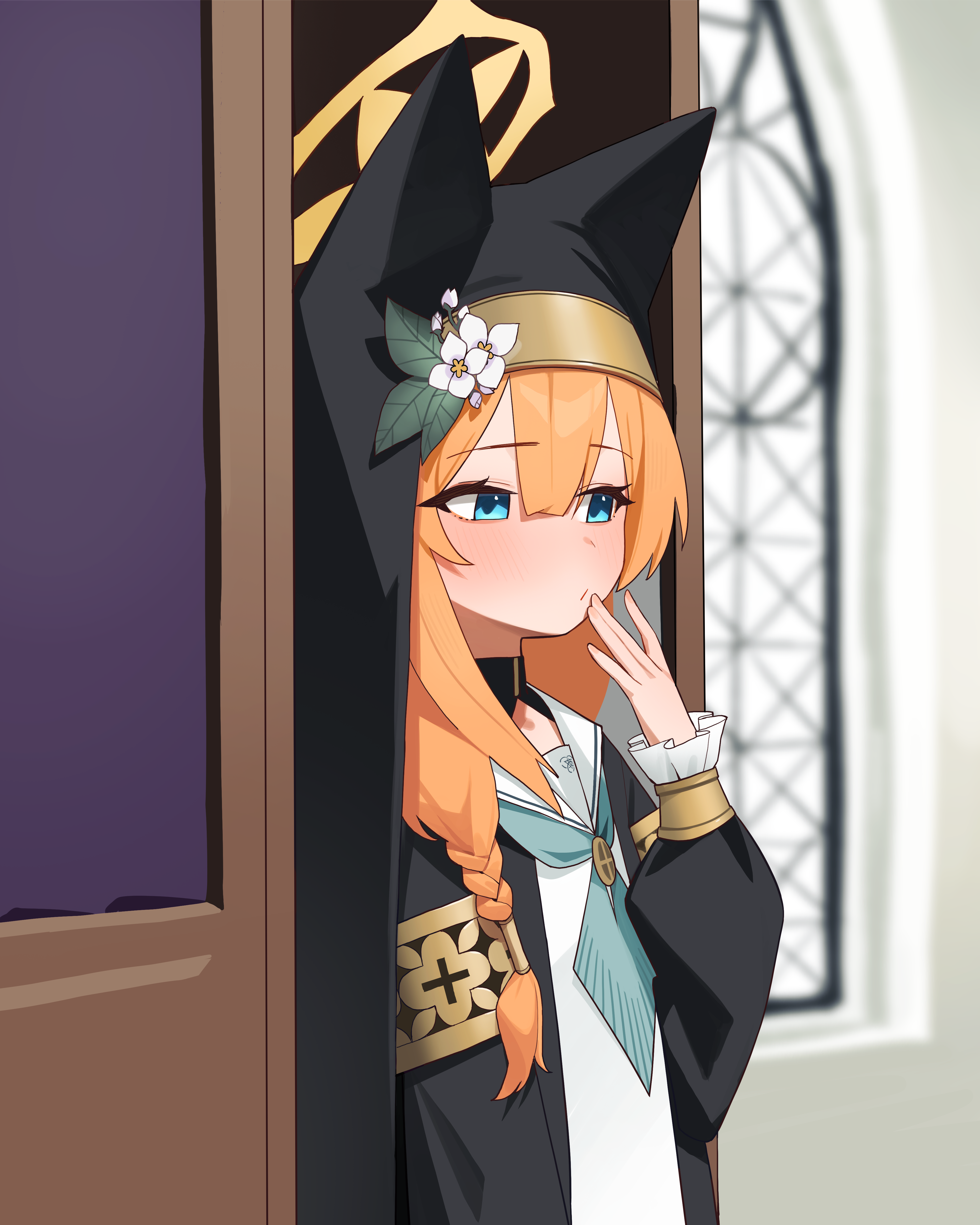 1girlanimal ear headweararmbandblue eyesblue neckerchiefclosed mouthcoiffake animal earsflowerfrom sidehalohathat flowerlong hairlong sleevesneckerchieforange hairsoloupper bodywhite floweryellow armbandyellow halo