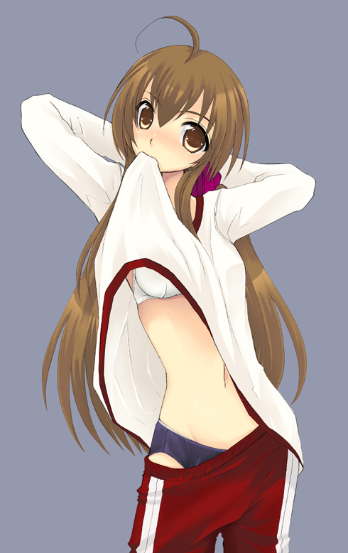 ahogebrabrown eyesbrown hairclothes liftlingerielong hairmouth holdshirt liftsolounderwearundressing