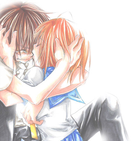 00s1boy1girlbrown hairclosed eyescomfortingcoupleheterohugkissorange hairschool uniformserafukushort hairtears