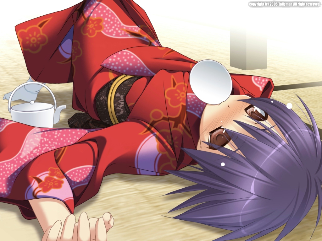 1girlblue hairblushbrown eyesdrunkfemale focusjapanese clotheskimonolyingmouth holdon backon floorpitcher (container)saucershort hairsolotabiupside-down