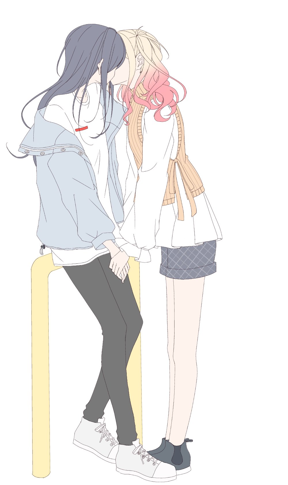 2girlsblack hairblack pantsblack shoesblonde hairblue jacketgradient hairgrey shortsholding handsjacketkisslong hairmulticolored hairmultiple girlspantspink hairshirtshoesshortssimple backgroundsweater vesttwintailsuwanosora 03white backgroundwhite shirtwhite shoesyellow sweater vestyuri