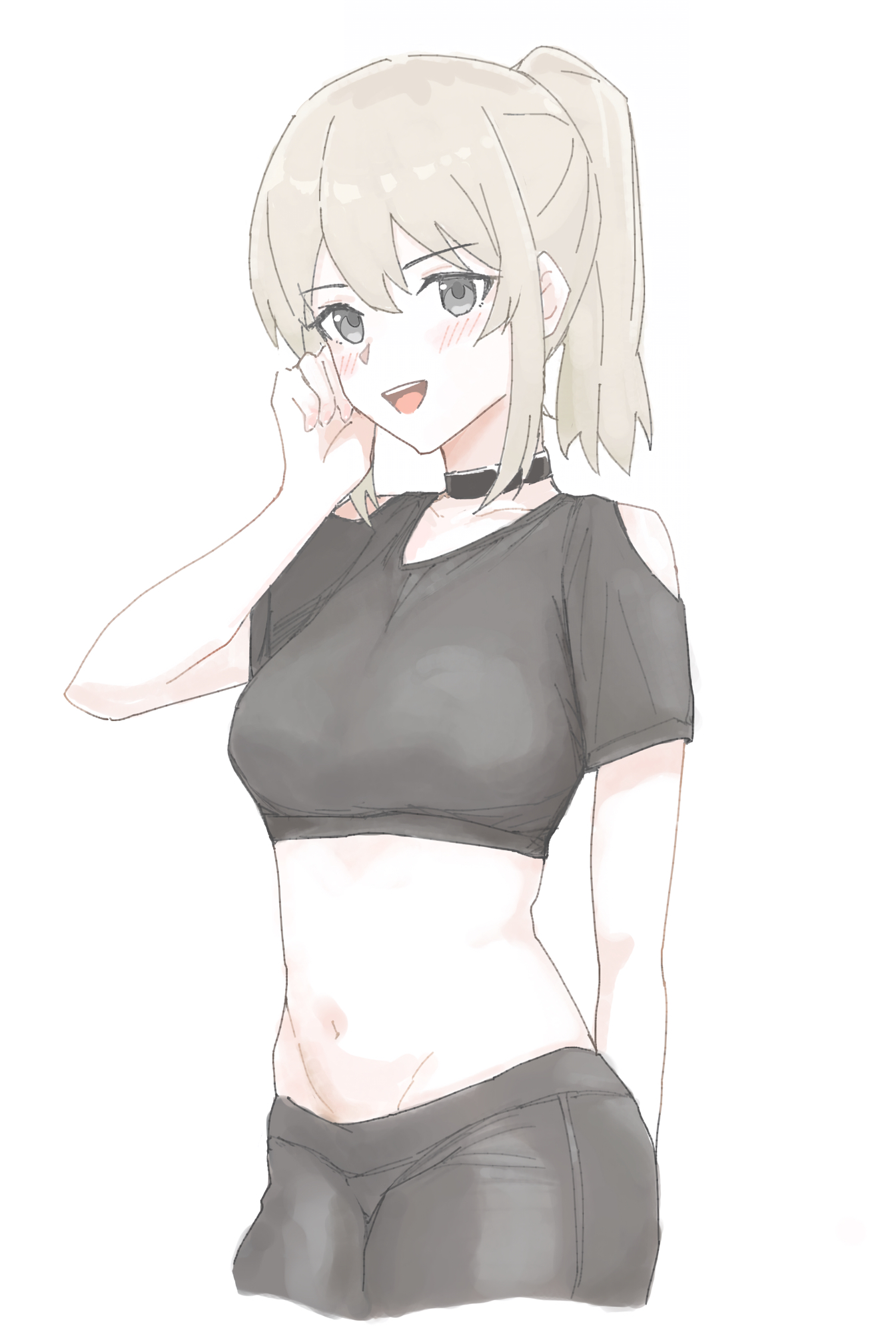 1girlblack chokerblack pantsblack shirtblushbreastschokerclothing cutoutcollarbonecrop topgrey eyesgrey hairlong hairlooking at viewermedium breastsmidriffmulticolored hairnavelopen mouthpantsponytailroots (hair)shirtshort sleevesshoulder cutoutsidelockssimple backgroundsolostomachteethupper teeth onlywhite background