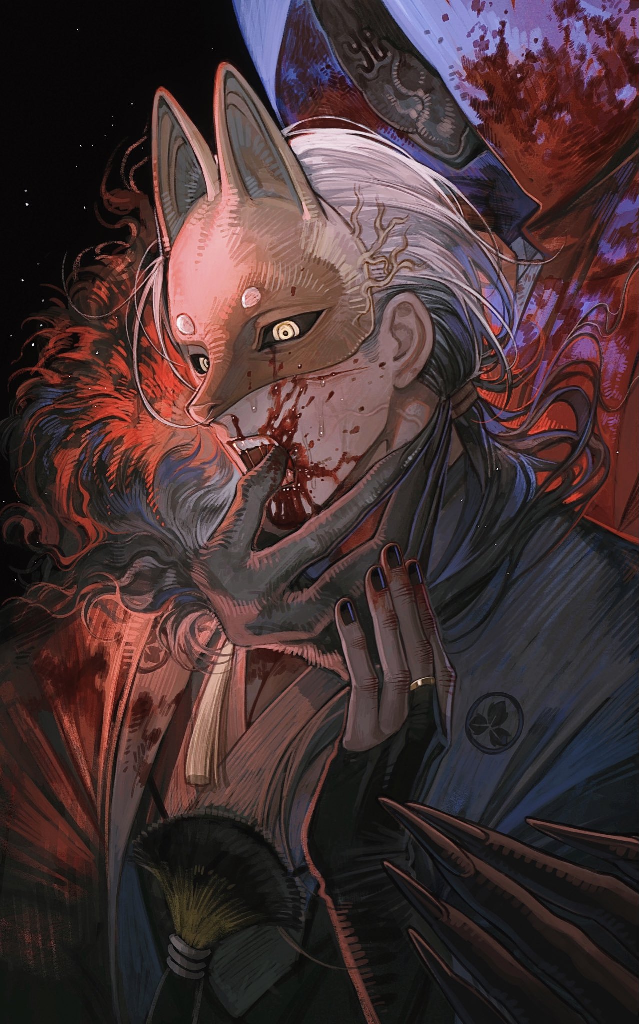 1boy1girlblack nailsblack sclerabloodblood from mouthblood on facebridal gauntletsclawscolored scleraearringsfox maskhair tiejapanese clothesjewelrykimonolong hairlow ponytailmasknail polishnosebleedopen mouthponytailringed eyestasseltassel earringsuchikakeupper bodywhite hairyellow eyes