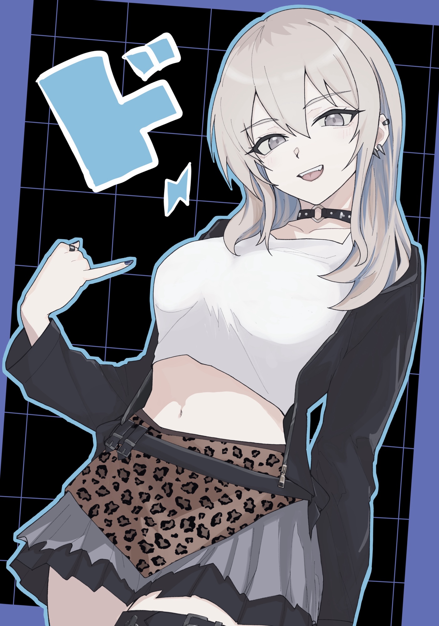 1girlblack chokerblack jacketblue nailsblue outlinebreastschokercowboy shotcrop topear piercinggrey eyesgrey hairhair between eyesjacketjewelrylarge breastslong hairmidriffmulticolored hairnail polishnavelo-ringo-ring chokeropen clothesopen jacketopen mouthoutlinepiercingpinky outringroots (hair)solotank topteeththigh strapupper teeth onlywhite tank top
