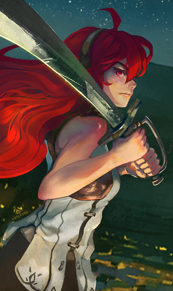 1girlahogebandanaholdingholding swordholding weaponlooking to the sideoutdoorsred eyesred hairsefokususkysolostar (sky)starry skyswordtwo-handed swordweapon