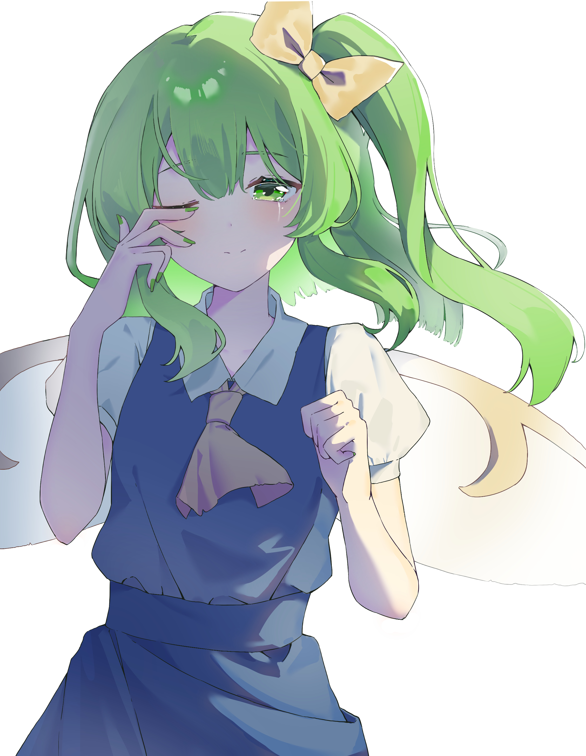 1boy1girlascotbare armsblue dressblushbowdressfairyfairy wingsfingernailsgreen eyesgreen hairhair bowlong hairnail polishone eye closedone side uppinafore dresspuffy short sleevespuffy sleevesshirtshort sleevessimple backgroundsleevelesssleeveless dresssmilesolotearswhite backgroundwhite shirtwingsyellow ascotyellow bow