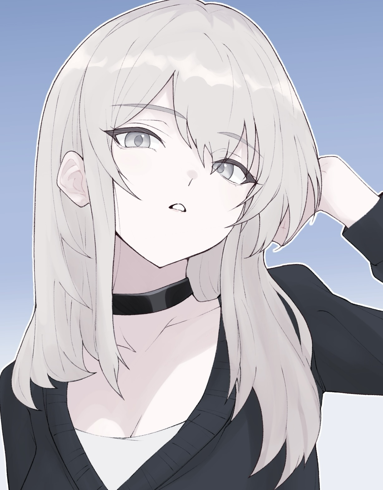 1girlarm upblack chokerblack sweaterblue backgroundbreastschokercleavagecollarbonegradient backgroundgrey eyesgrey hairlong hairlong sleeveslooking at viewermulticolored hairopen mouthoutlineroots (hair)sidelockssolosweaterupper bodywhite outline