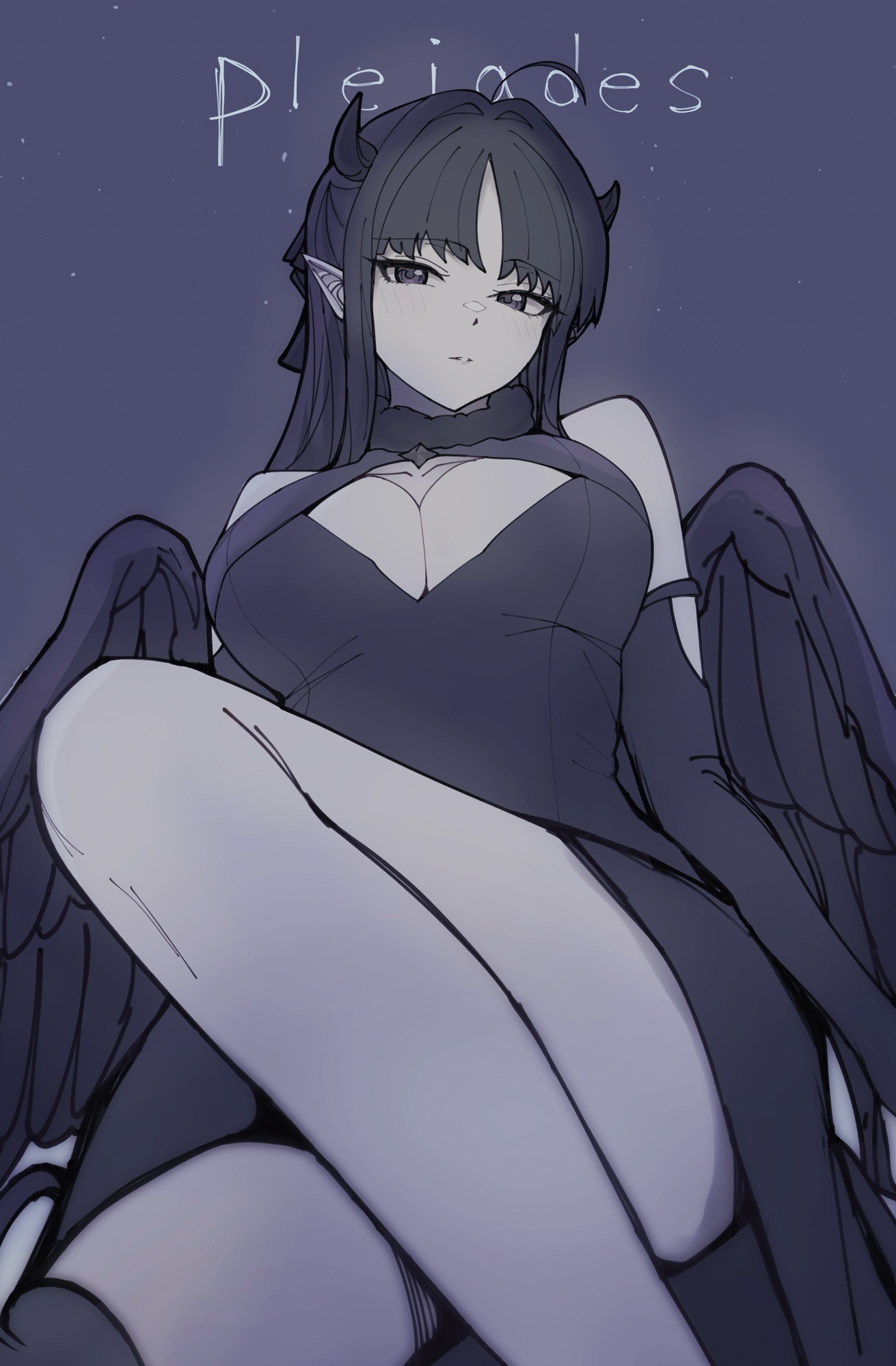 1girlahogeblack dressblack hairblack nailsblack wingsblushbreastscleavagecleavage cutoutclothing cutoutdetached sleevesdressfeathered wingsgrey backgroundhair intakeslarge breastslong hairparted bangsparted lipspointy earspurple eyessidelockssleevelesssleeveless dresssolowings