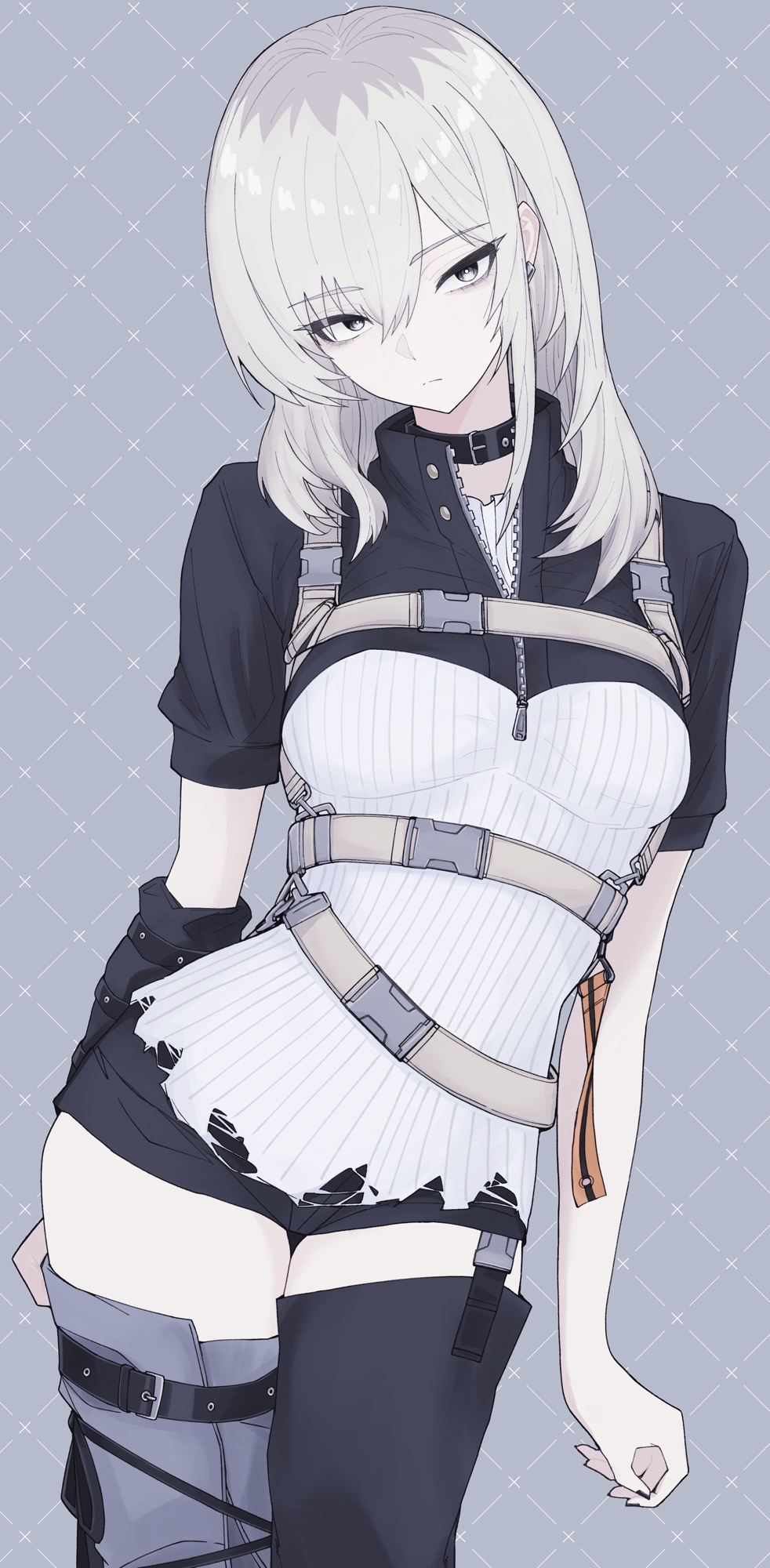 1girlasymmetrical legwearblack chokerblack jacketblack shortsblack thighhighschest strapchokerclosed mouthearclipgradient backgroundgrey backgroundgrey eyesgrey hairjacketlong hairlooking at viewermismatched legwearmulticolored hairmulticolored jacketroots (hair)short sleevesshortssolothighhighstwo-tone jacketwhite jacket