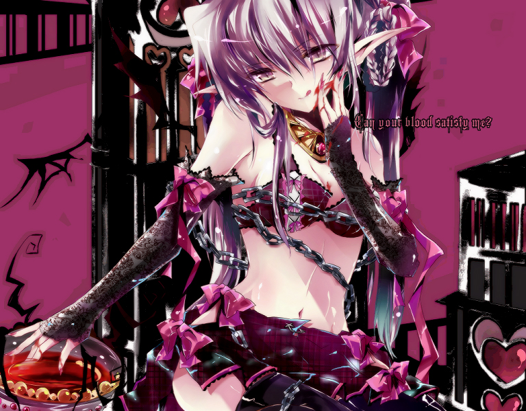 :q1girlbloodbrachainelbow gloveselfenglish textfemale focusfingerless glovesgloveslingerielong hairmidriffnail polishpointy earspurple hairribbonsolotonguetongue outunderwearyellow eyes