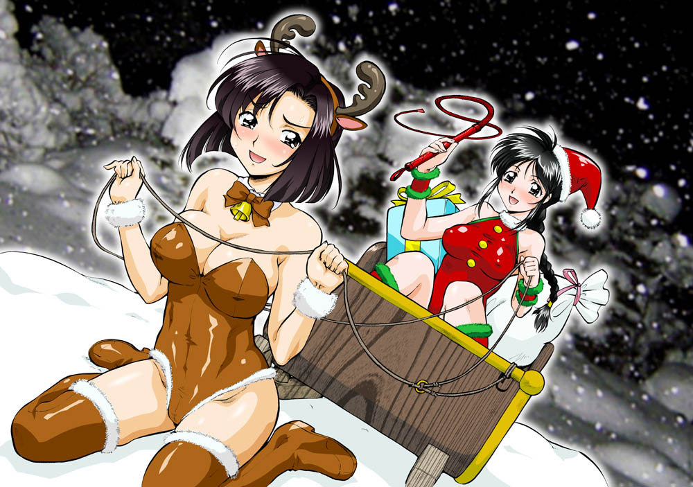 2girlsantlersblack eyesblack hairbootsbowbowtiebraidbrown hairchristmasdetached collardutch anglehathornsleotardlong hairmultiple girlsneck bellnontraditional playboy bunnyplayboy bunnyred leotardsanta costumesanta hatshort hairsnowthighhighswhip