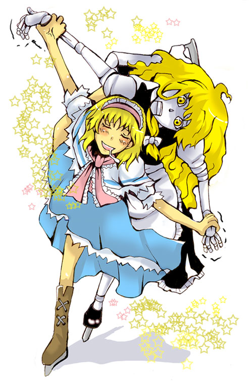 1girlblonde hairblushdolldressdroolingfemale focusfull bodyhair ribbonice skateslong hairribbonsalivashort hairskatessolostar (symbol)white backgroundyellow eyes