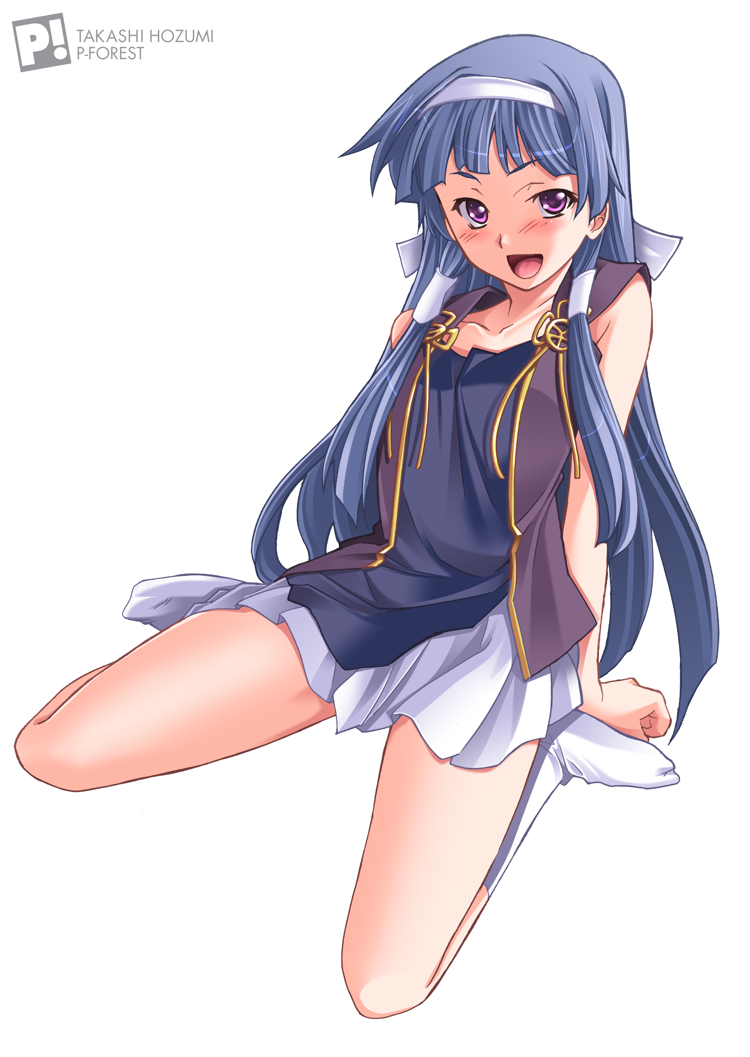 :d00s1girlblue hairblunt bangsblushcollarbonefemale focushair tubeshairbandlong hairopen mouthpleated skirtsittingskirtsmilesockssolowarizawhite skirt