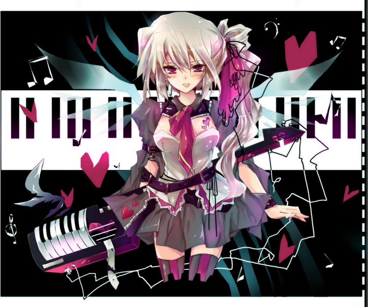 1girlblushbreastscleavagefemale focushair ribbonheartinstrumentkeytarlong hairpianored eyesribbonside ponytailskirtsolothighhighswhite hairzettai ryouiki