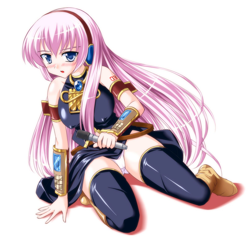 1girlblue eyesbreastscovered erect nipplesfemale focuslarge breastslong hairmicrophonepantiespantyshotpink hairsolothighhighsunderwearwhite panties