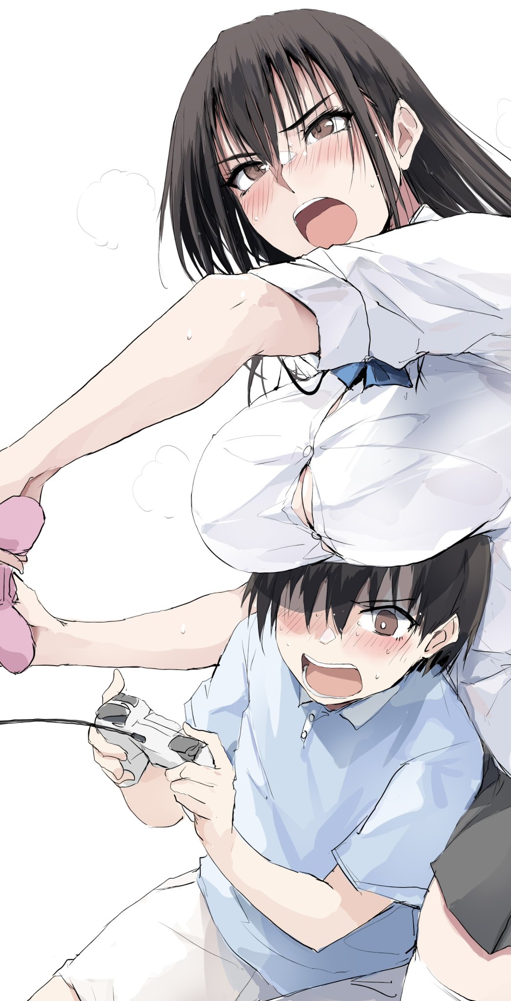 1boy1girlage differenceawkwardblack hairblack skirtblue shirtblushbreast restbreastsbursting breastscontrollergame controllerhair between eyesholdingholding controllerholding game controllerlong hairone eye closedopen mouthschool uniformshirtshort sleevesshortssimple backgroundskirtteethvery long hairwhite backgroundwhite shirtwhite shorts