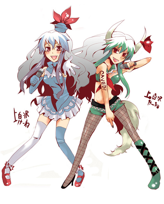 2girlsblue haircaved (touhou)female focusfishnet pantyhosefishnetsfull bodygreen hairhorn ornamenthorn ribbonhornslong hairmicrophonemiddle fingermultiple girlspantyhosered eyesribbonsimple backgroundspread legsstandingthighhighswhite background