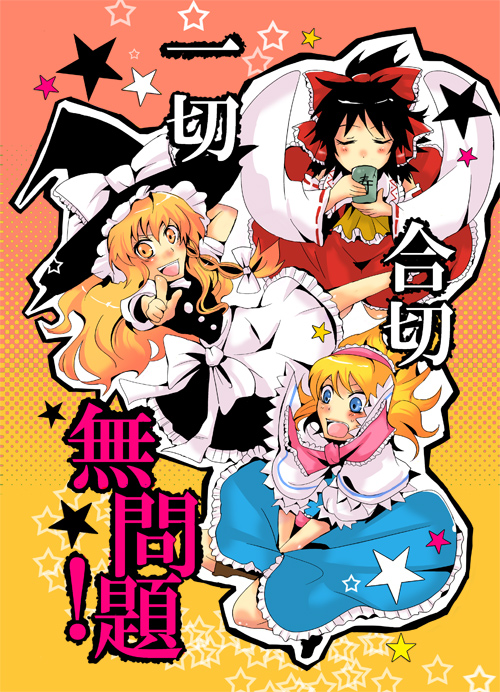 3girlsblack hairblonde hairblue eyesbraidclosed eyesdetached sleevesdressfemale focushair ribbonhairbandhalftonehalftone backgroundhatjapanese clotheslong hairmikomultiple girlsribbonshort hairstar (symbol)witchwitch hatyellow eyes