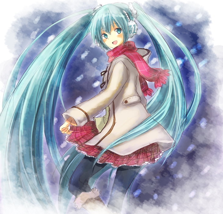 1girlaqua eyesaqua hairbootscoatearmuffsfemale focusknee bootslong hairpantyhosered scarfscarfskirtsnowsolotwintailsvery long hair