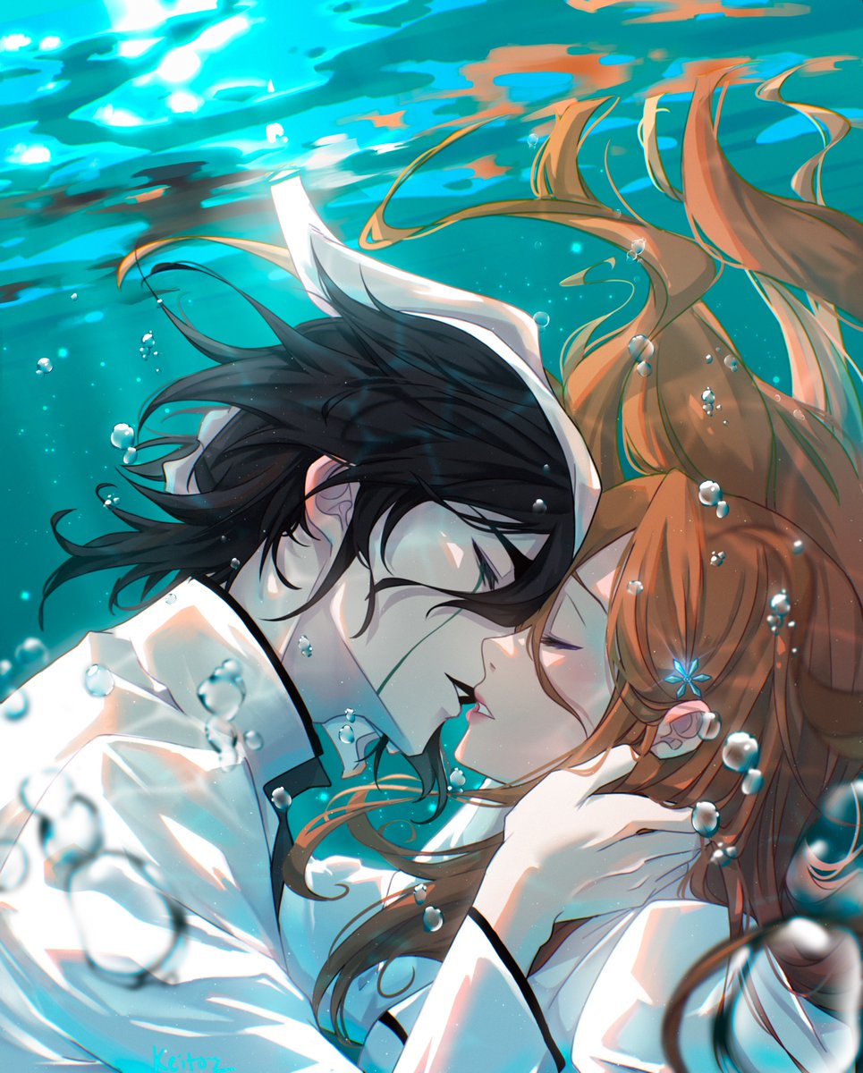 air bubbleblack hairblack lipsbrown hairbubblecouplehair between eyeshair ornamenthalf maskhand in another's hairheteroimminent kissjacketkeitozlong hairmaskmedium hairparted lipspink lipssnowflake hair ornamentunderwaterupper bodywhite jacket