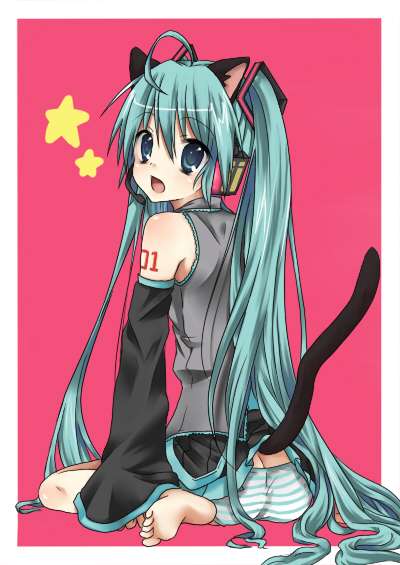 ahogeanimal earsaqua eyesaqua hairbarefootcat earscat taildetached sleevesfeetheadsetlong hairlooking backnumber tattooopen mouthpantiesshoulder tattoosimple backgroundsittingsolessolostriped clothesstriped pantiestailtattootoestwintailsunderwearvery long hair