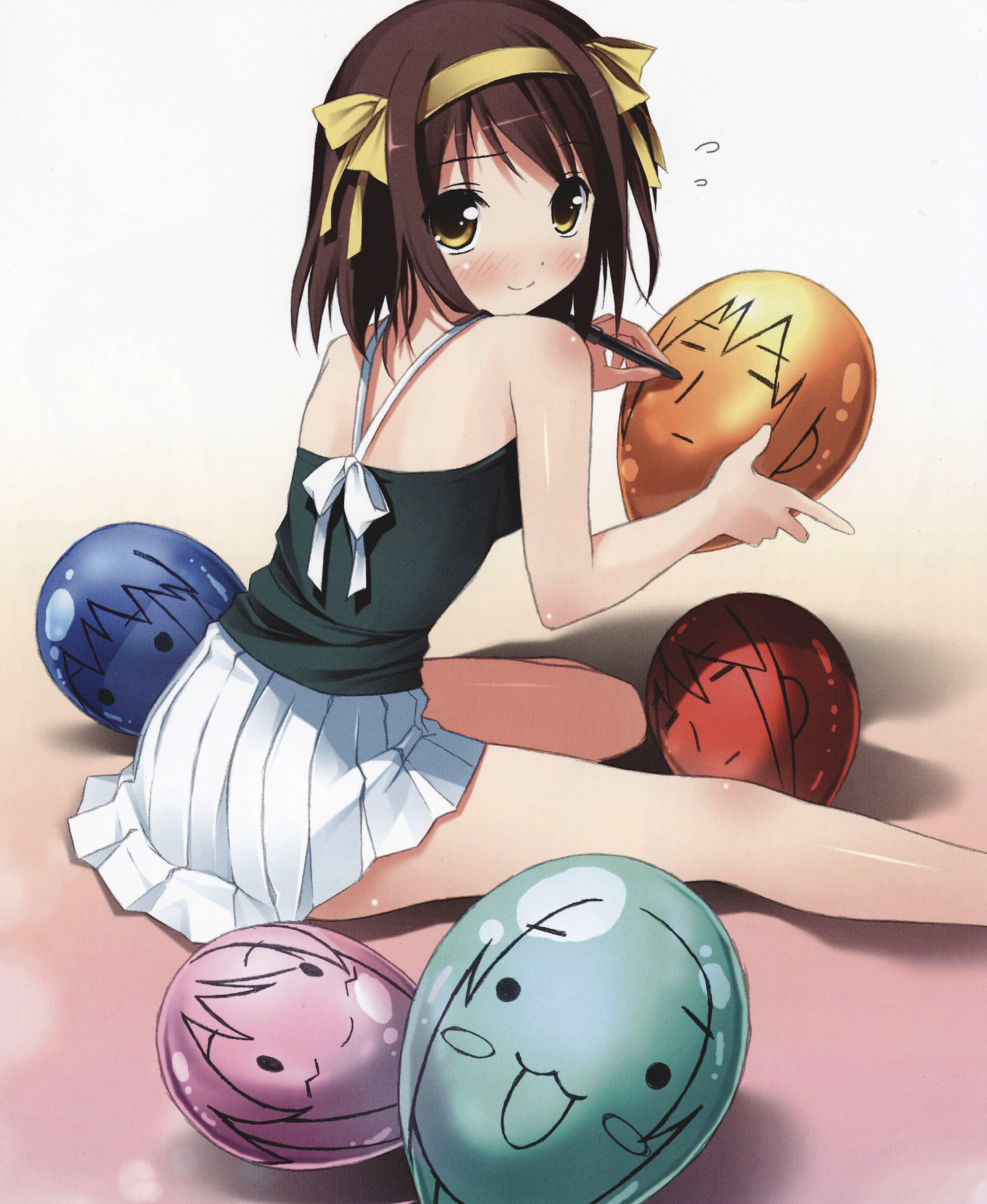 00s1girlballoonblushbrown haircasualdrawing (action)female focushairbandlooking backpleated skirtshort hairsittingskirtsoloyellow eyes