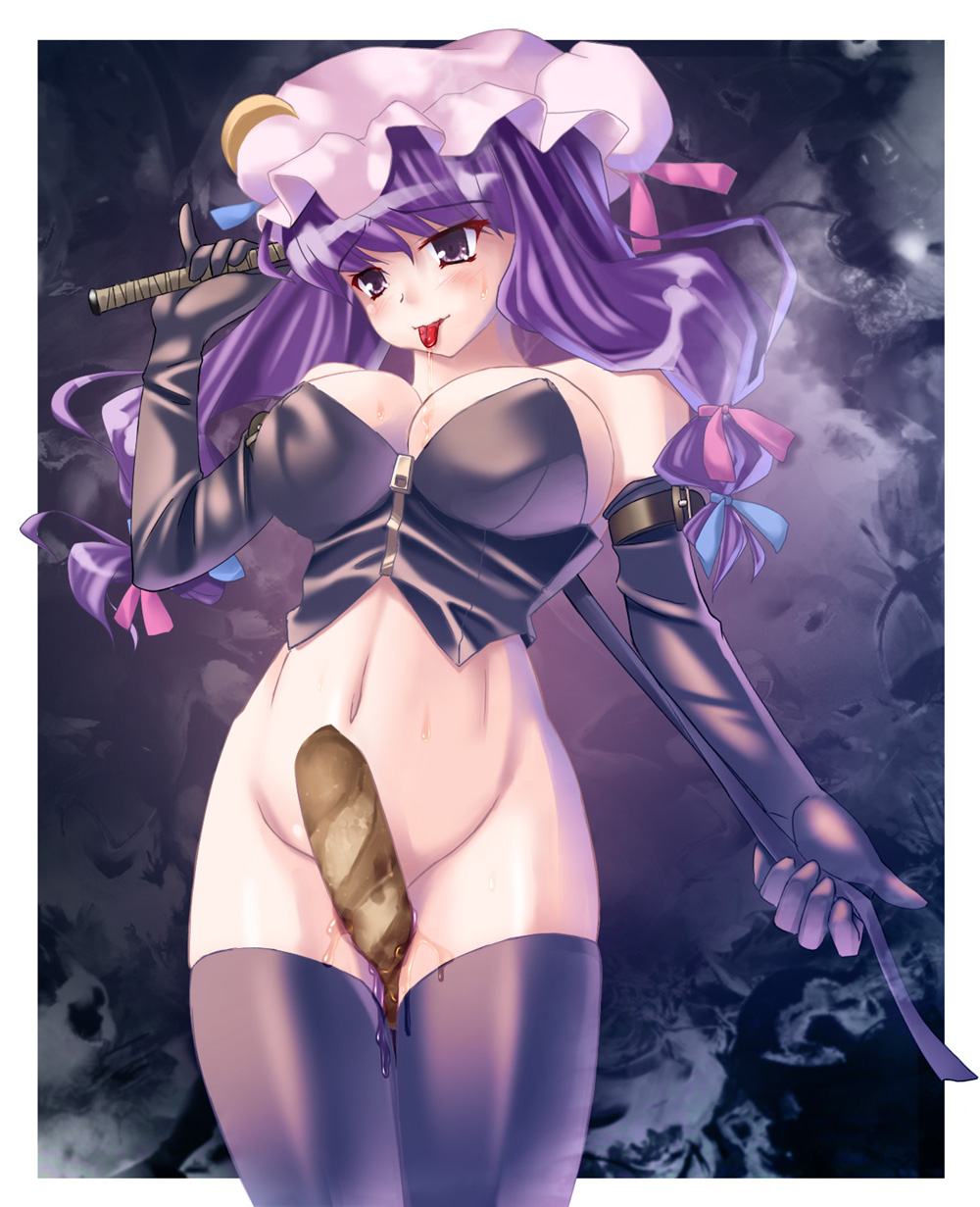1girlbowbreadbreastscleavagedominatrixelbow glovesfemale focusfoodgloveslarge breastslong hairno pantiespink bowpurple hairsolothighhighs