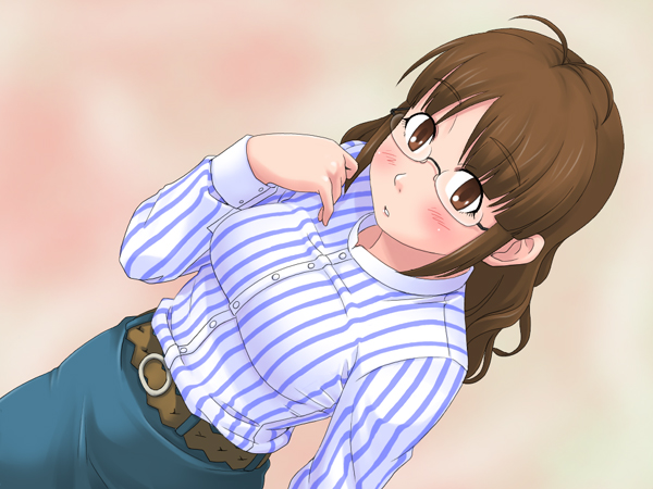 :o00s1girlantenna hairbeltblue skirtblushbreastsbrown eyesbrown hairbuttonscowboy shotdutch anglefemale focusfrom aboveglassesgradient backgroundhair downlong hairlong sleeveslooking at viewerlooking upmedium breastsrimless eyewearshirtskirtsolostriped clothesstriped shirttaremevertical-striped clothesvertical-striped shirtwavy hair