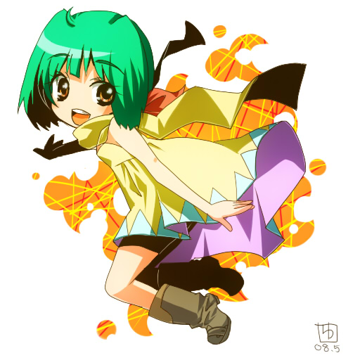 :d00s1girlbare shouldersbrown eyeschibifemale focusfull bodygreen hairlooking at vieweropen mouthshort hairsimple backgroundsmilesoloturtleneckwhite background