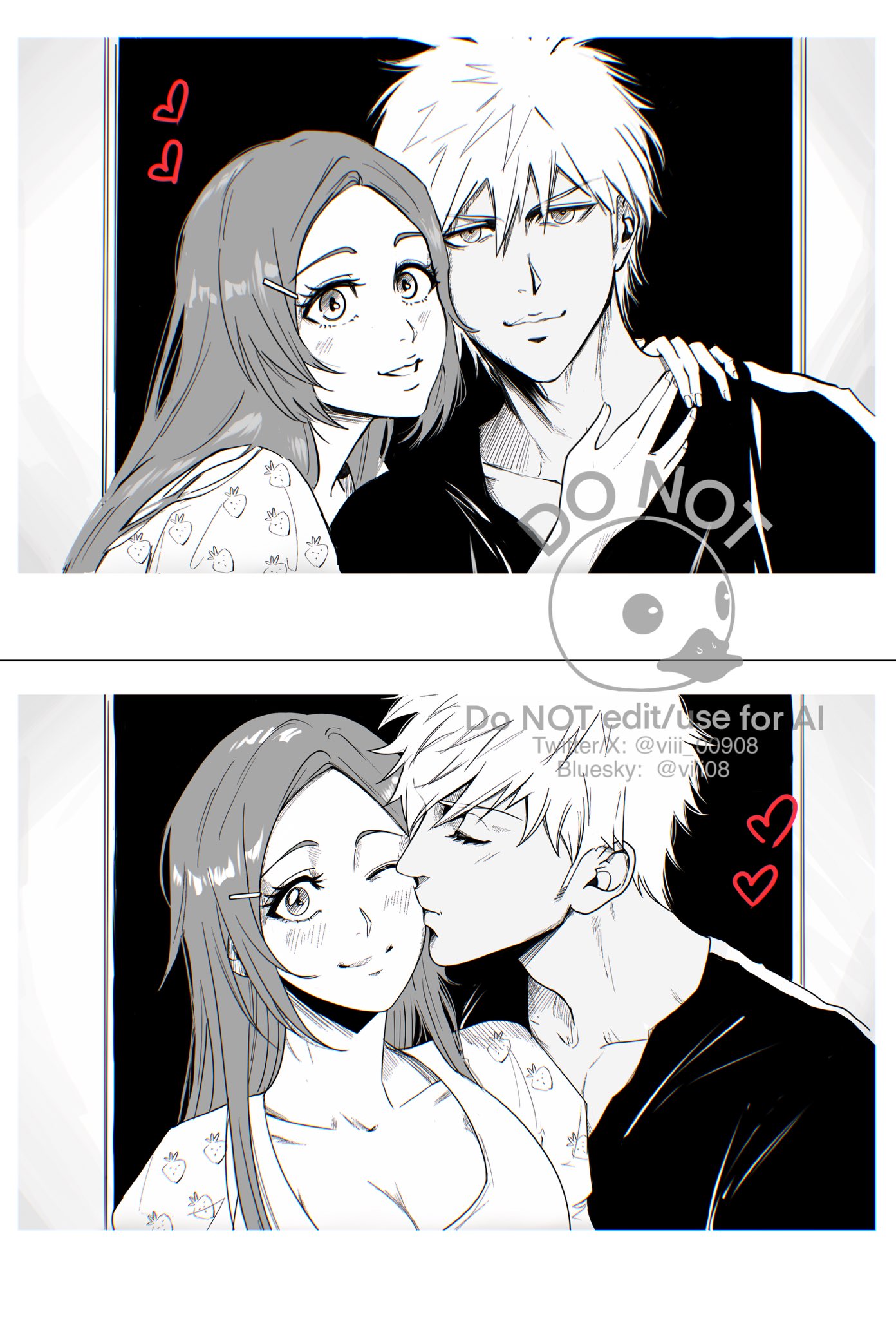 1boy1girlarms around neckblack shirtbluesky usernamebreastscleavageclosed eyescouplefood printfruit printhair between eyeshair ornamenthairclipheterokisskissing cheeklarge breastslight blushlong hairone eye closedparted bangsparted lipsprint shirtshirtshort hairstrawberry printtwitter usernameupper body