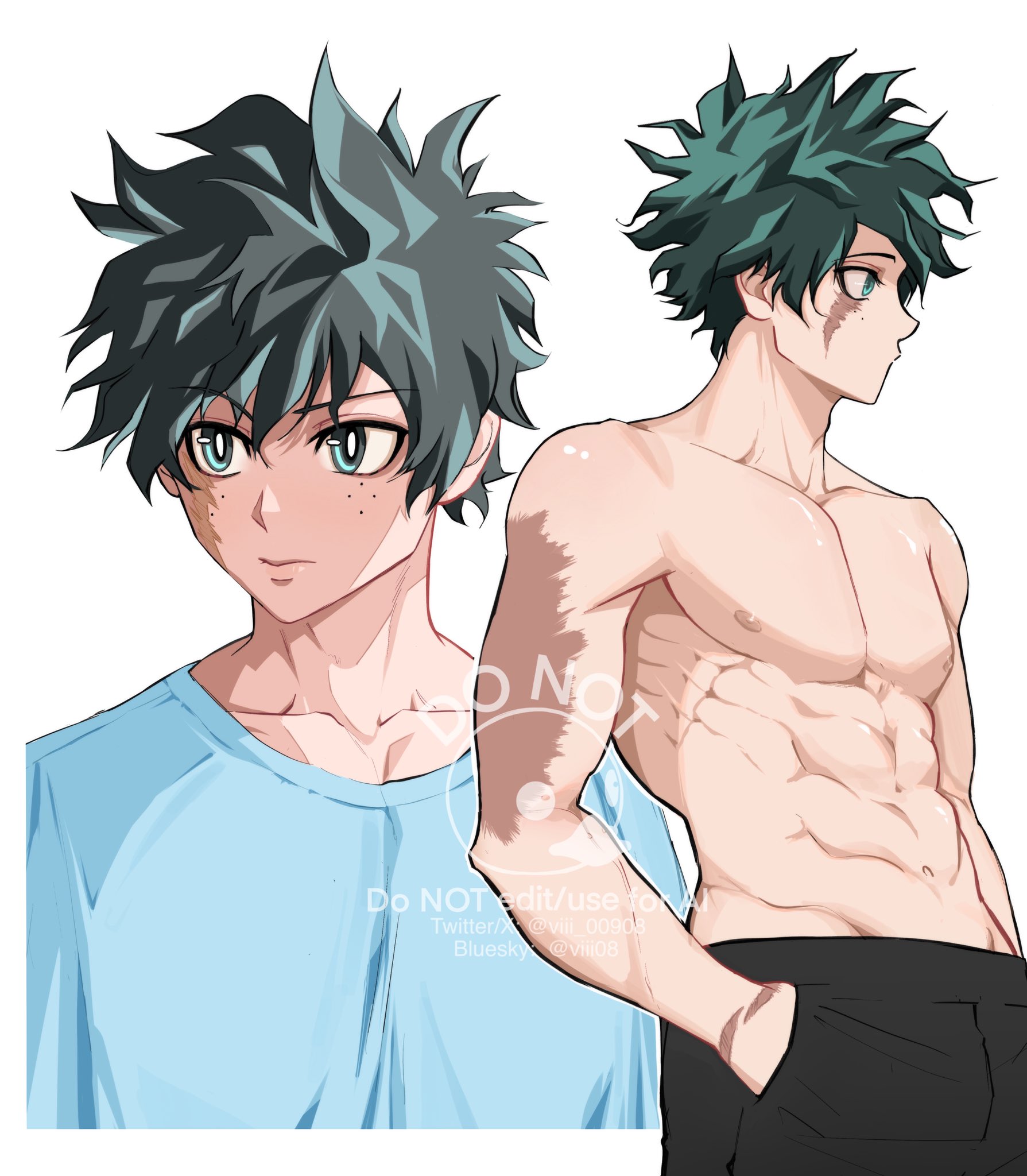 1boyaqua eyesblack shortsblue shirtbluesky usernameclosed mouthcollarbonecowboy shotfacial scarfrecklesgreen hairhair between eyeshand in pocketmale focusmultiple viewsmuscularmuscular malescarscar across eyescar on armscar on cheekscar on facescar on handshirtshort hairshortssolotopless maletwitter usernamewhite background