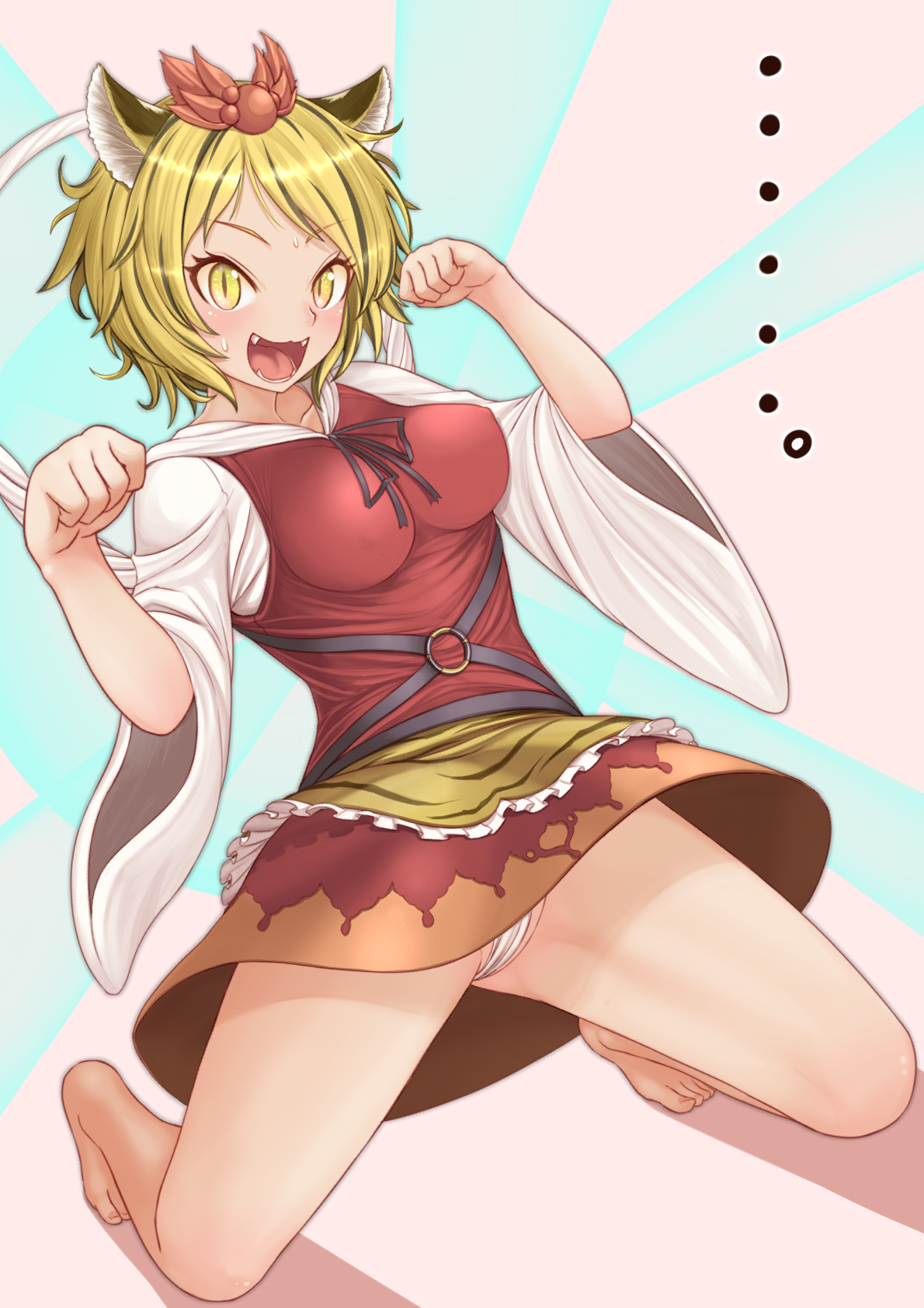 1boy1girlanimal earsbarefootblack hairblack ribbonblonde hairblue backgroundblushbreastscat daycat earscat girldressfangsfull bodyhair ornamentimpossible clothesimpossible dresskemonomimi modekneelinglong sleeveslooking at viewermedium breastsmulticolored hairneck ribbonopen mouthpantiespaw posepinafore dressred dressribbonshirtshort hairsleevelesssleeveless dressslit pupilssolospoken ellipsisstreaked hairsunburstsunburst backgroundunderwearwhite backgroundwhite pantieswhite shirtwide sleevesyellow eyes