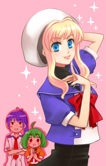 togashi yuu, kirisame marisa, touhou, 1girl, apron, black dress, blonde hair, blue eyes, blush, dress, female focus, frills, hat, layered sleeves, long sleeves, looking at viewer, puffy short sleeves, puffy sleeves, short over long sleeves, short sleeves, solo, tareme, v arms, waist apron, witch hat