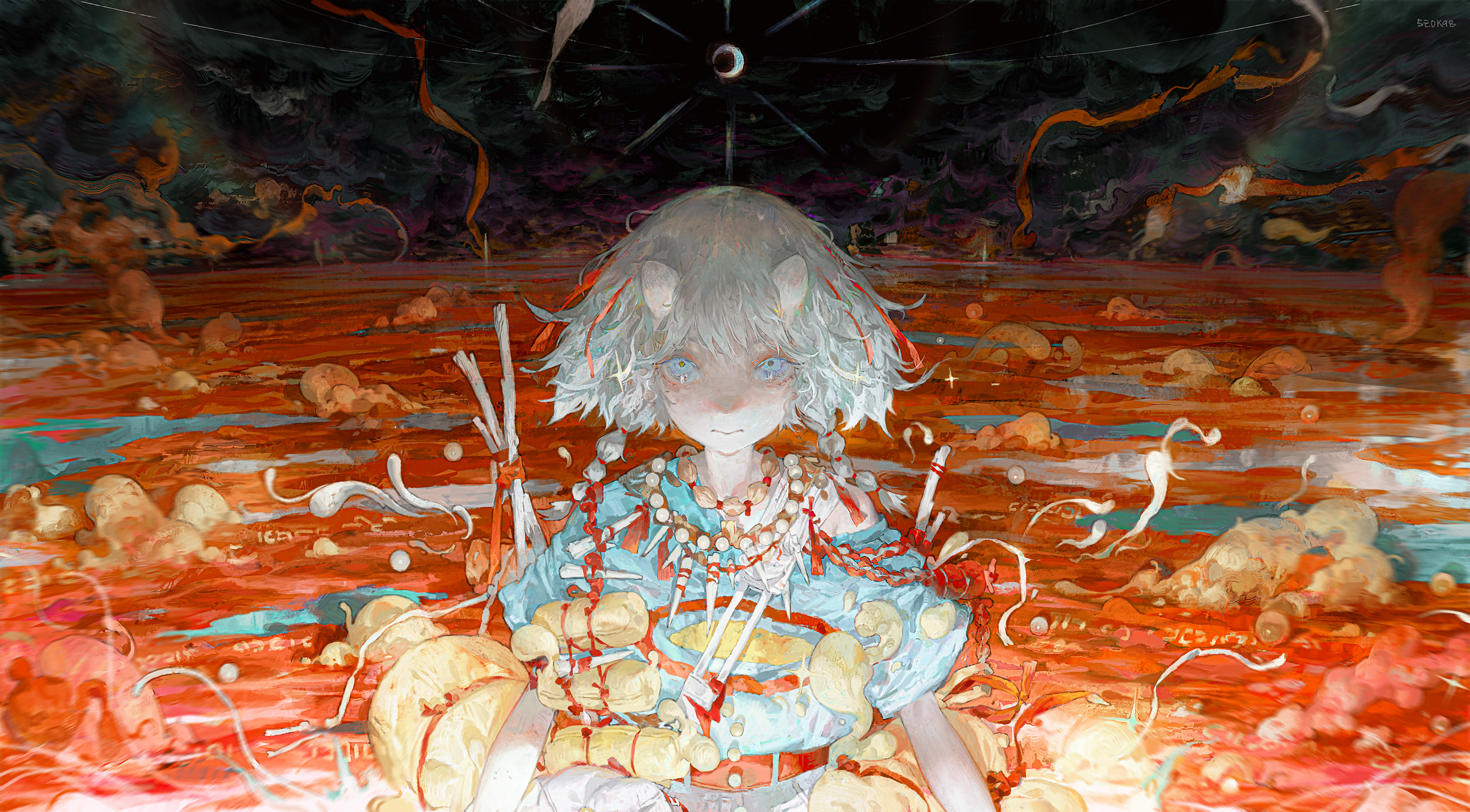 1girlartist namebraidcrescent moonhornslow twin braidsmoononishort sleevessolotwin braidswhite hair