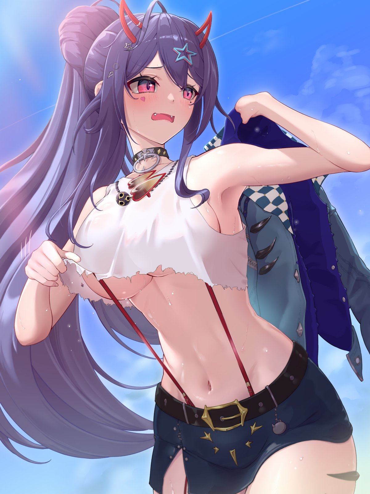 1girlbeltblack beltblack chokerblack collarblue skybreastschokercollarcrop topcrop top overhangcropped shirtfacial markfake hornsfangshair ornamentheartheart facial markholding unworn jackethornslinea albalong hairmidriffmolemole under eyenavelofficial alternate costumeopen mouthpink eyesponytailpurple hairshirtsideboobskysleevelesssleeveless shirtsolostar (symbol)star hair ornamentstomachsunglassessuspenderssweattorn clothestorn shirtunderboobunworn eyewearvirtual youtuber