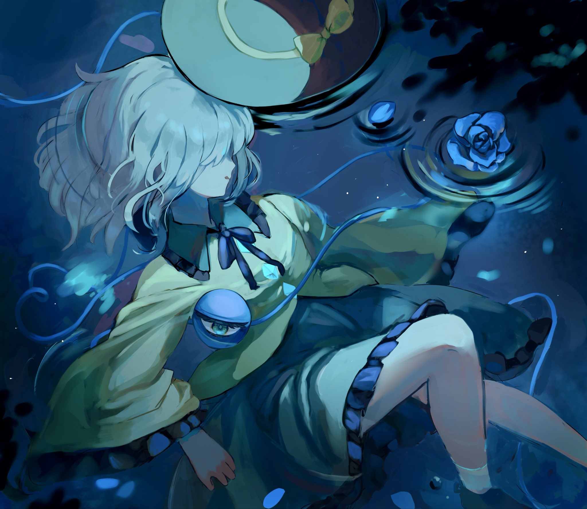 1girlblack hatblonde hairblue eyesclosed eyesfloatingflowergreen skirthatheartheart of stringnightreflectionribbonroseshirtshort hairskirtsolothird eyetumetaisnowwateryellow ribbonyellow shirt